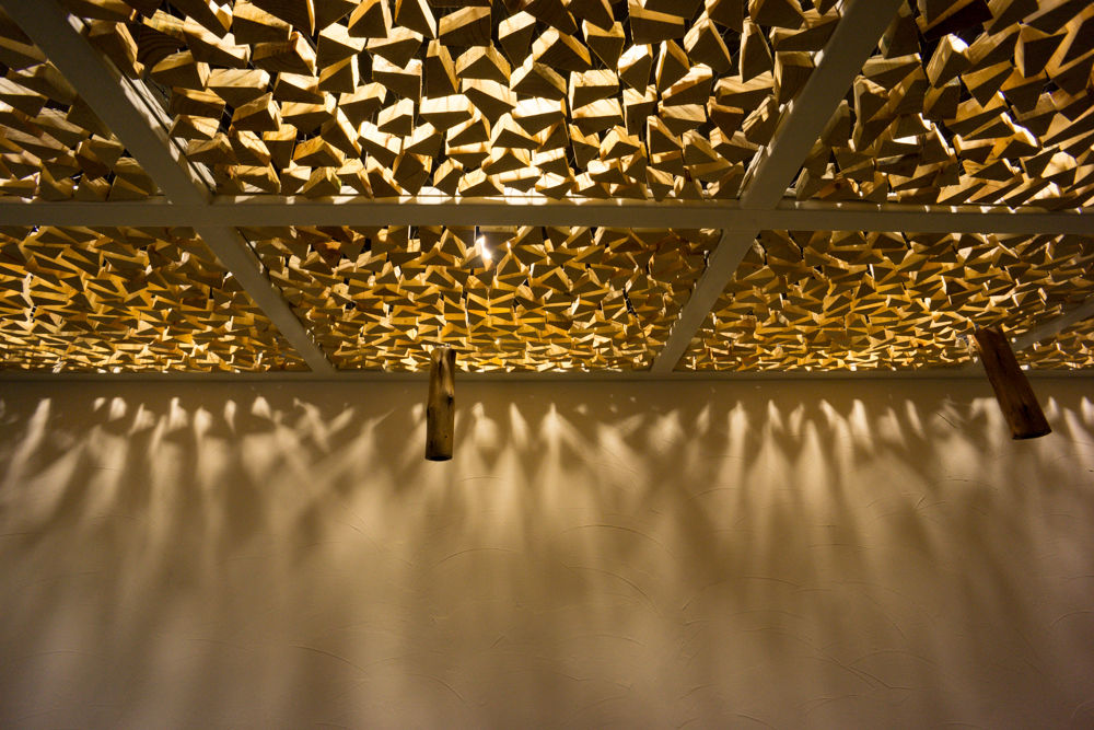 Sankyodai is the Japanese restaurant located in Bangkok. The owner’s requirement is to utilise the wood material in a new way to create an atmosphere of Japanese nature. Under the limited budget, recycled eucalyptus wood from construction site that use as a supporter is chosen as main material. It can be found from construction site around that area which sell very cheap. The collected wood is chopped into small pieces then attach to the suspend ceiling to create the warm and Japanese traditional atmosphere.